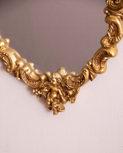 This elegant wall mirror features an intricately designed gold frame with baroque-style embellishments. The mirror is suspended using a decorative pearl-like chain, attached to a gold fan-shaped wall mount, adding a luxurious and artistic touch. The combination of antique aesthetics and modern hanging style makes it a perfect decor piece for a sophisticated or vintage-inspired interior.