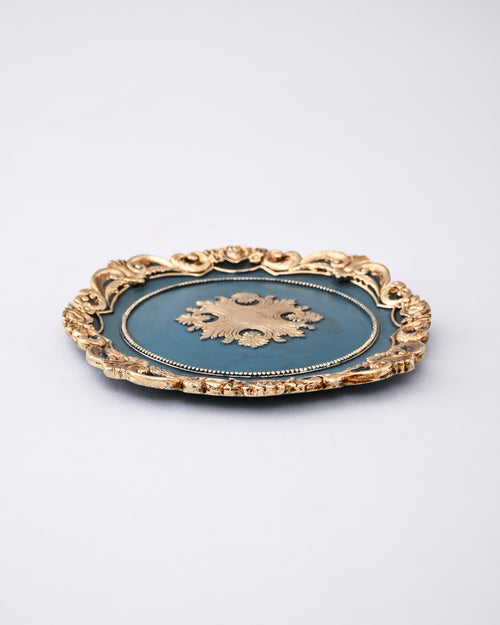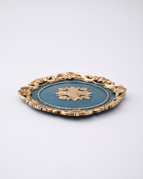 A beautifully crafted vanity tray featuring an intricate gold frame and a rich blue base adorned with an elegant crest motif. Its antique-inspired design exudes timeless luxury and sophistication, perfect for displaying jewelry, perfumes, or decorative accents on a dresser or console table.