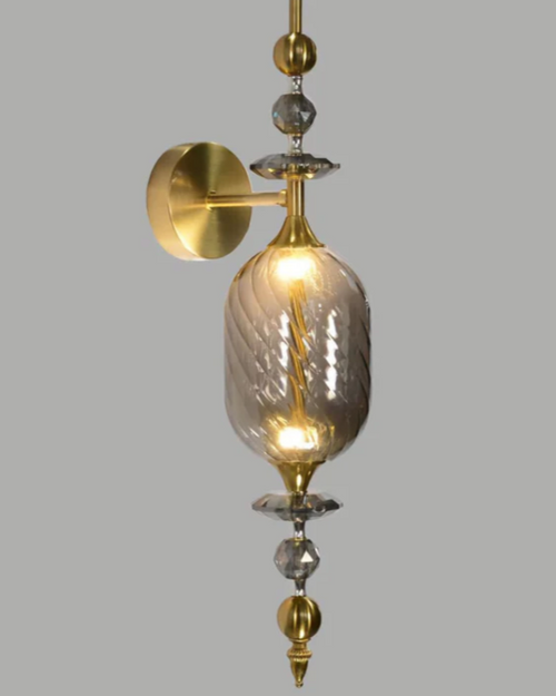 This majestic wall light showcases a barrel-shaped smoked glass shade with a swirled pattern, beautifully paired with sparkling crystal elements and a rich golden metal frame. The ornamental design exudes royalty and sophistication, making it perfect for enhancing premium interior spaces. The warm illumination through the textured glass adds depth and character, ideal for hallways, bedrooms, or luxury lounges.