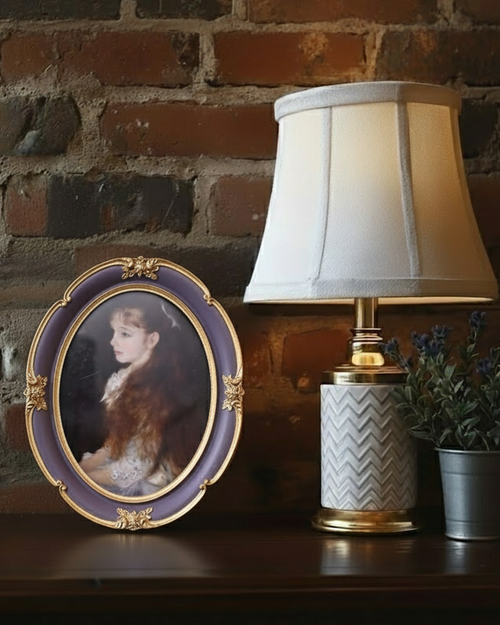 This Vintage Royal Oval Photo Frame features an elegant oval shape with a rich, muted purple border accented by ornate golden floral embellishments. The antique-style detailing and smooth enamel-like finish give it a timeless charm reminiscent of European aristocratic décor.
