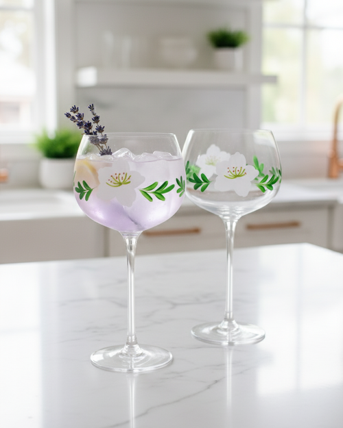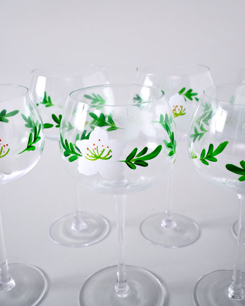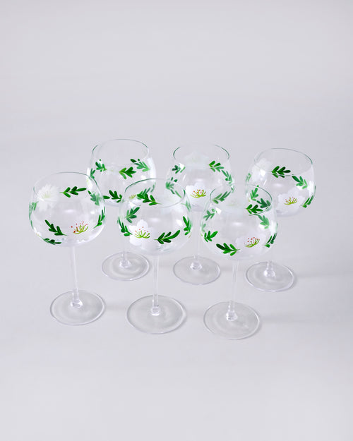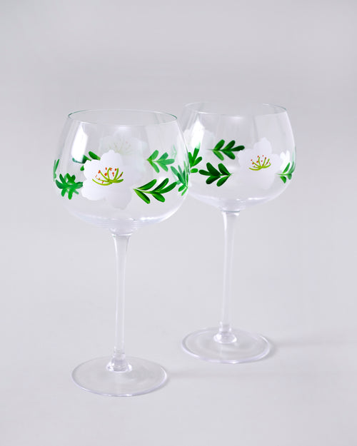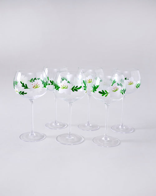 A graceful wine glass adorned with hand-painted white floral motifs and fresh green leaves. The wide bowl and slender stem create an elegant silhouette, while the delicate design adds a refreshing, nature-inspired charm perfect for elevating any celebration or cozy evening drink.