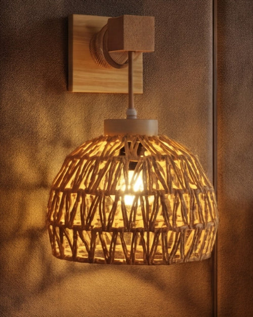 The Woven Dome Wall Light features a natural woven shade in a dome shape with a wooden wall mount. It gives a soft, warm glow and creates beautiful shadow patterns on the wall. This light is perfect for bedrooms, living rooms, cafés, and cozy corners, adding a natural, handmade look to the space.