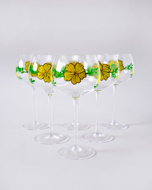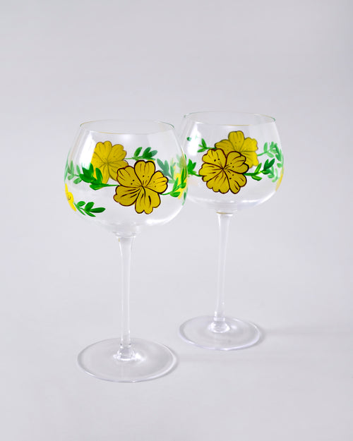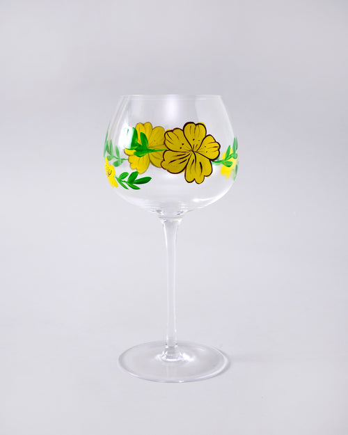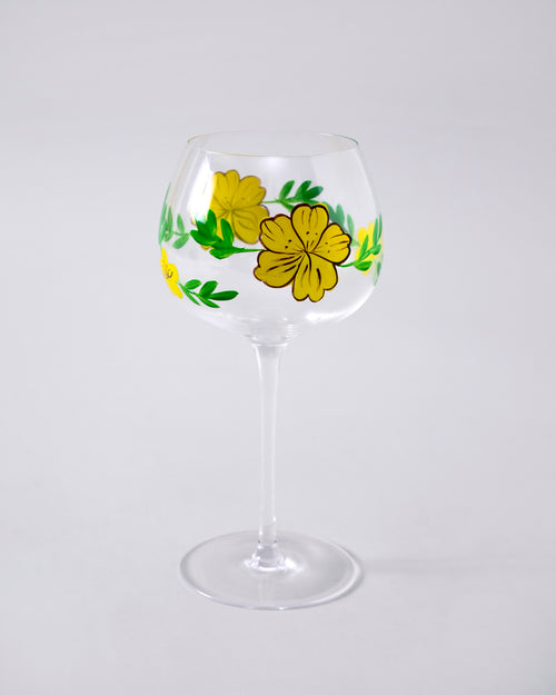 A graceful wine glass adorned with hand-painted yellow floral motifs and fresh green leaves. The wide bowl and slender stem create an elegant silhouette, while the delicate design adds a refreshing, nature-inspired charm perfect for elevating any celebration or cozy evening drink.